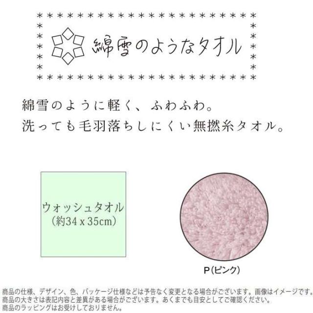 ウォッシュタオル。約34x35cmの大きさ。綿雪のように軽く、ふわふわ。洗っても毛羽立ちしにくい無撚糸タオル。綿雪のようなタオルのパイルには、新疆綿が使用されています。綿の繊維を1本1本揃える工程を通しているため、毛羽落ちが少なく、綿雪のように軽くふわふわとした風合いに仕上がっています。カラーは、ピンク(4975942396329:WTY-4001P)です。※製品リニューアルのため、型番が記載のものと異なる場合がございます。
