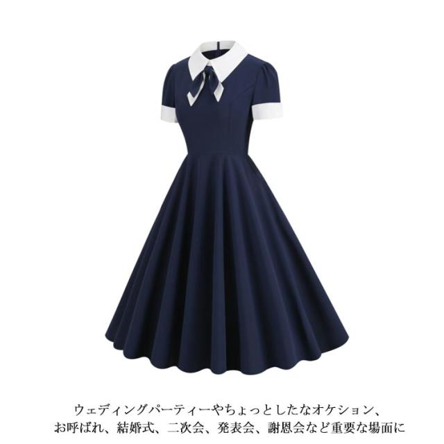 レトロワンピース ワンピース 夏 レトロ ドレス 襟あり リボン付き Aラインワンピース 半袖 ハイウエスト 可愛い 着痩せ ボタン 膝丈 50年代 お呼ばれ 恩会 披露宴 オールシーズン