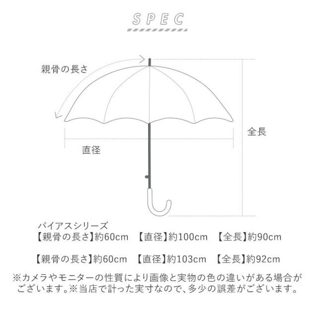 | サイズ | [親骨の長さ]約60cm/[直径]約103cm/[全長]約92cm ・バイアスシリーズ [親骨の長さ]約60cm/[直径]約100cm/[全長]約90cm ※サイズは当店計測の実寸サイズです。実際の商品ならびにメーカー表記サイズとは多少の誤差が生じる場合がございます。あらかじめご了承ください。 |