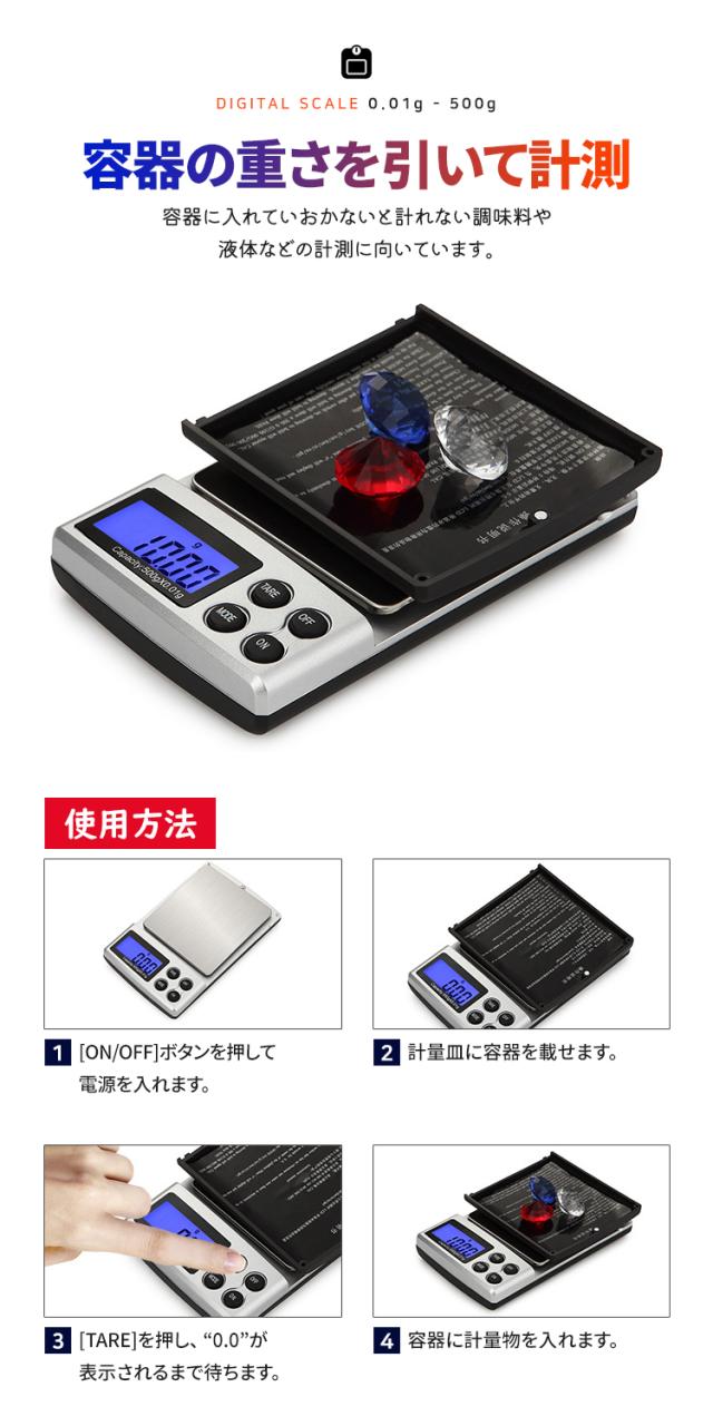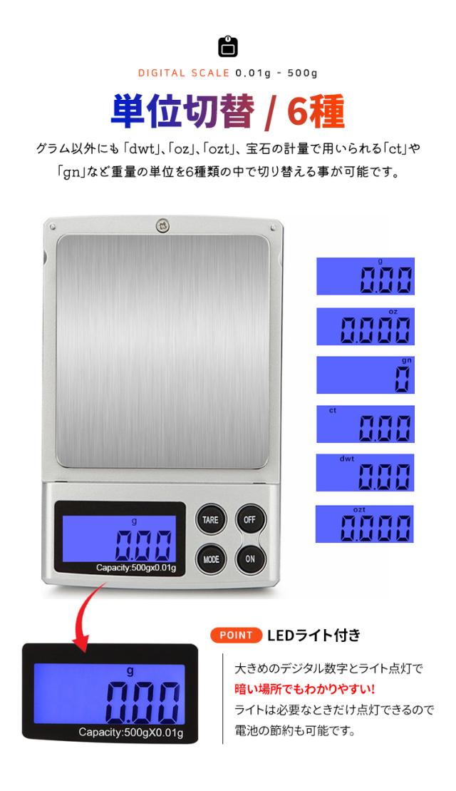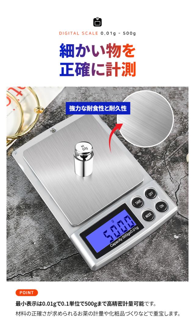 - 細かい物を正確に計測 (最小表示は0.01gで0.1単位で500gまで高精密計量)