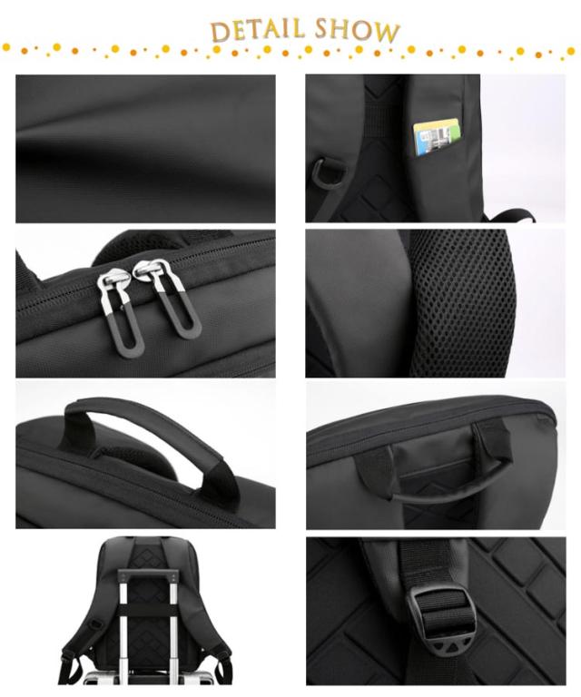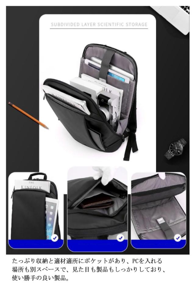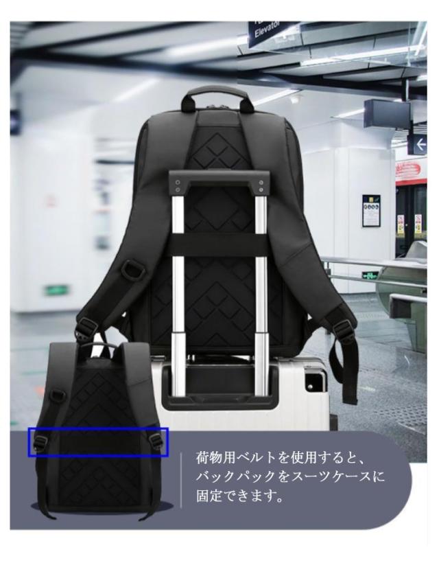 | 15.6インチのノートパソコン・タブレットも持ち運べる多機能ビジネスリュック。 防水・軽量・大容量で使い勝手の良いビジネスリュックです! その薄さは背負っていることを忘れるくらい体にフィット。 たっぷり収納と適材適所にポケットがあり、PCを入れる場所も別スペースで、見た目も製品もしっかりしており、使い勝手の良い製品。 超軽量素材なので、薄型デザインが採用されている。 荷物用ベルトを使用すると、バックパックをスーツケースに固定できます。 | |