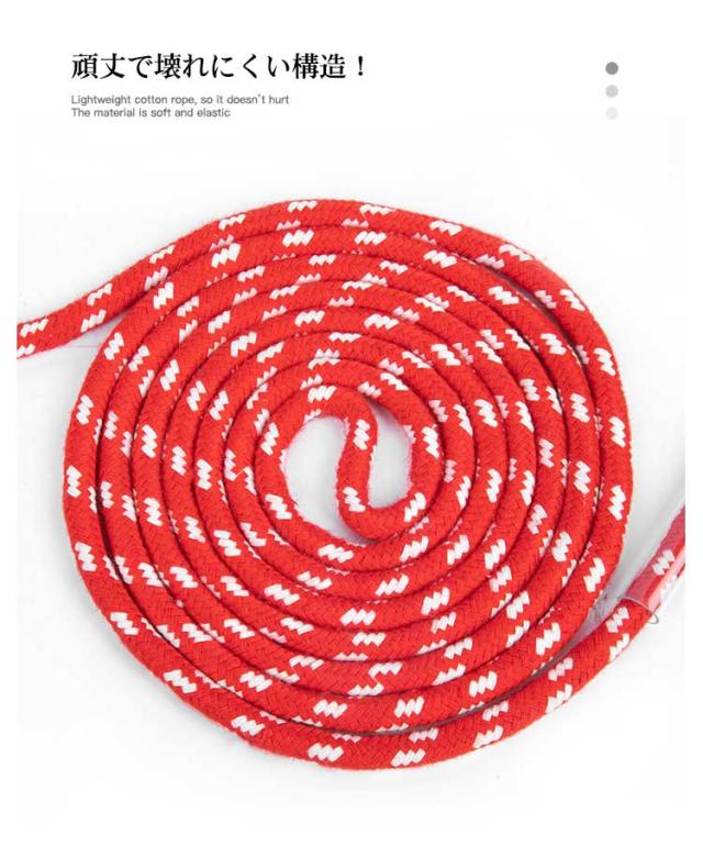 | サイズについての説明 | 縄長2.6m/ハンドル長12*3cm 【かんたん長さ調整】 グリップに収まっているロープを押し込んで引き出し、結び目の位置を変えるだけのかんたん構造。 お使いのジャストサイズに変更してお使いください。 |