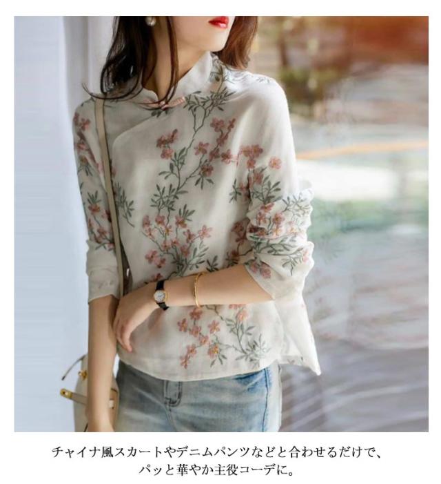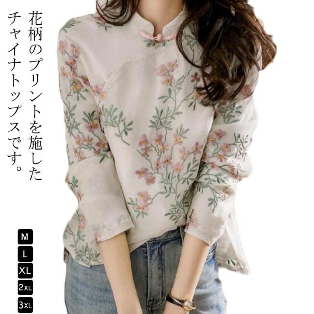 トップス ブラウス チャイナ風 チャイナ風 花柄 プリント カジュアル 送料無料 綿麻混 春 レディース プルオーバー チャイナボタン ゆったり 長袖 薄手 大人 夏