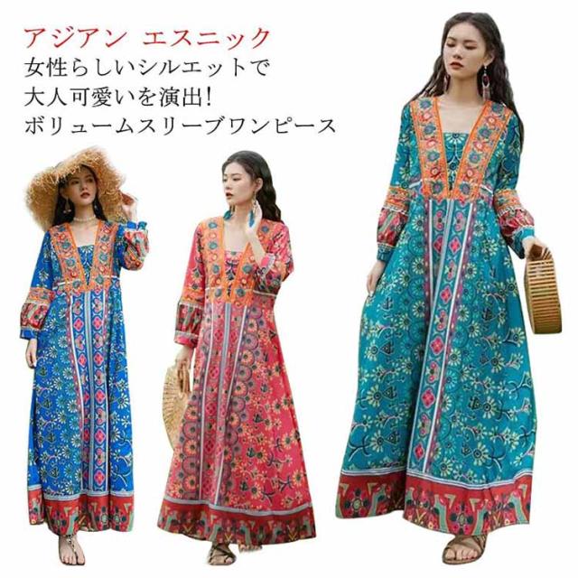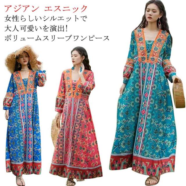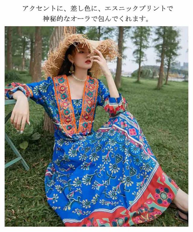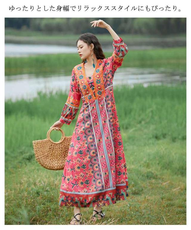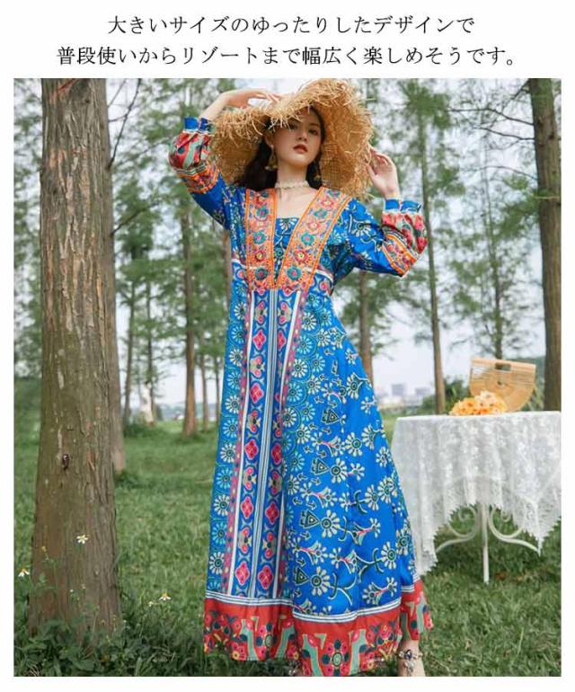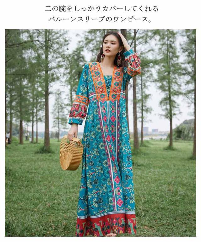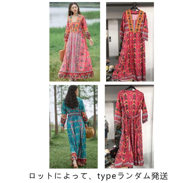 送料無料 Vネック ロングワンピース 夏 マキシ丈 着痩せ リゾート 花柄 長袖 スクエアネック ゆったり 夏 ワンピ ワンピース 体型カバー ボヘミアン かわいい シンプル レディース おしゃれ エスニックワンピース