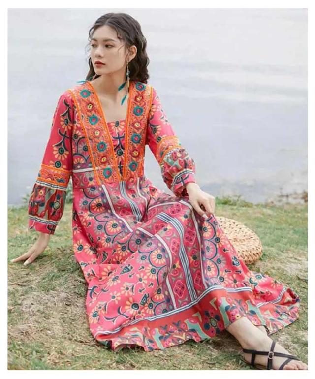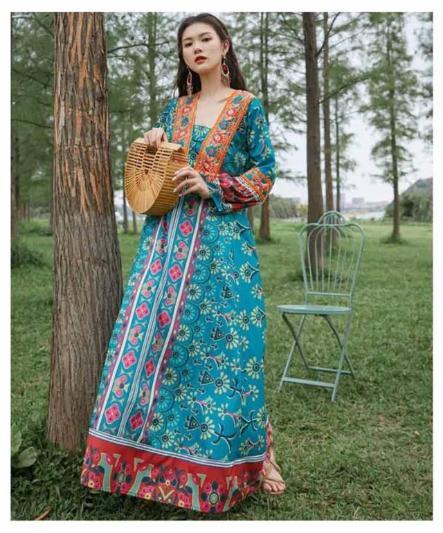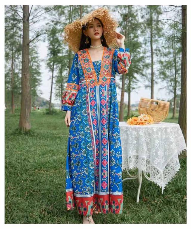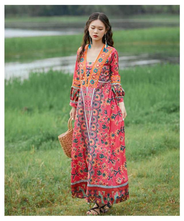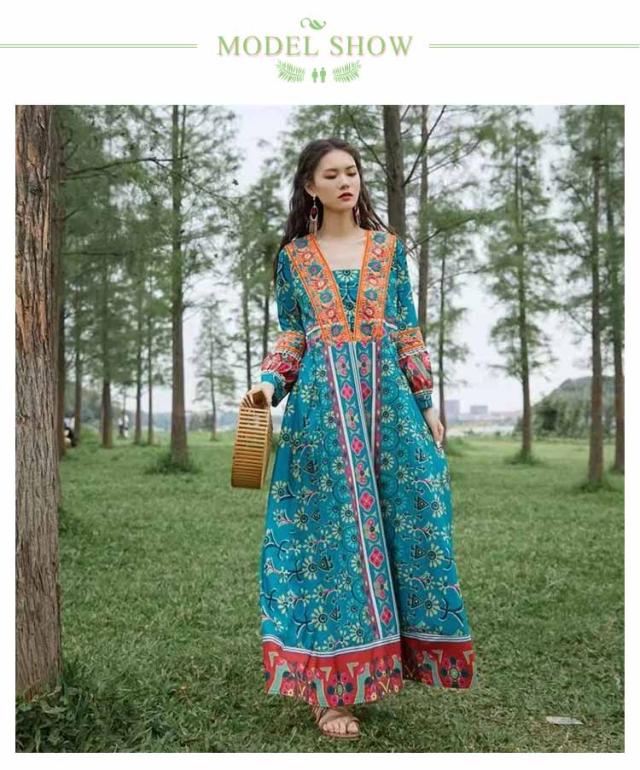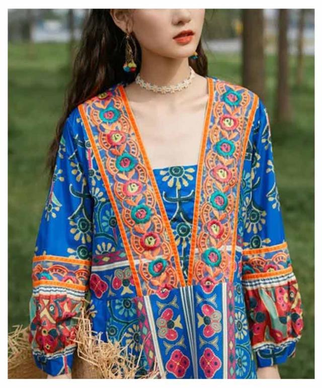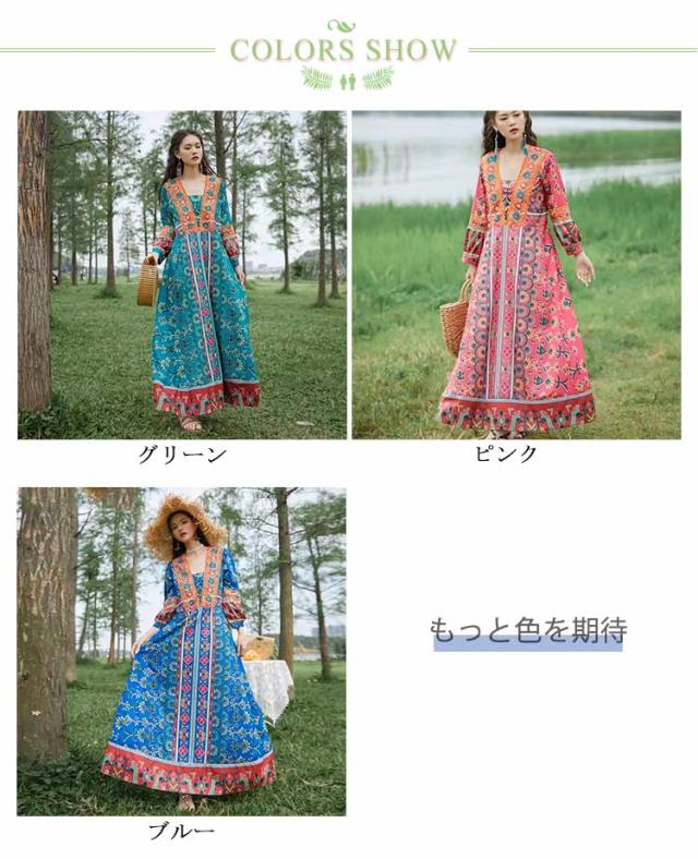 送料無料 Vネック ロングワンピース 夏 マキシ丈 着痩せ リゾート 花柄 長袖 スクエアネック ゆったり 夏 ワンピ ワンピース 体型カバー ボヘミアン かわいい シンプル レディース おしゃれ エスニックワンピース