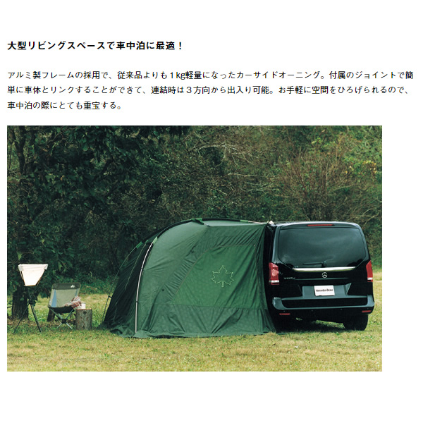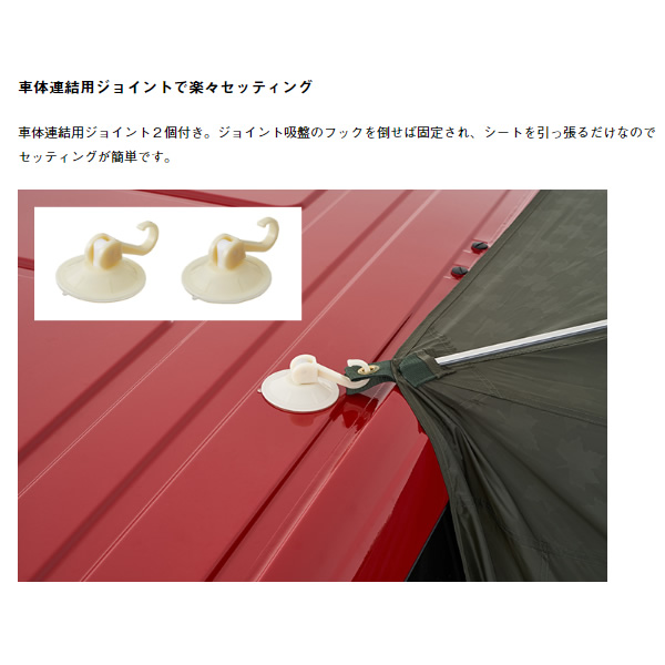 | 性能/特長 | [フライシート]防水加工、撥水加工、難燃加工、UV-CUT加工、フライドア&メッシュ、エンボス加工 ・車体連結時、三方向から出入り可能 ・車体連結用吸盤ジョイント付き(2個) |