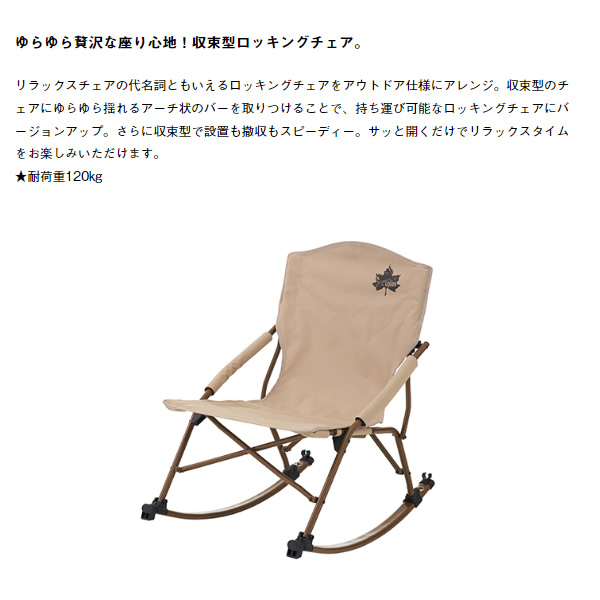 ゆらゆら贅沢な座り心地!収束型ロッキングチェア。 リラックスチェアの代名詞ともいえるロッキングチェアをアウトドア仕様にアレンジ。 収束型のチェアにゆらゆら揺れるアーチ状のバーを取りつけることで、 持ち運び可能なロッキングチェアにバージョンアップ。 さらに収束型で設置も撤収もスピーディー。 サッと開くだけでリラックスタイムをお楽しみいただけます。 ■総重量:(約)5.3kg ■サイズ:(約)高さ79×幅53.5×奥行74cm(座高40cm) ■収納サイズ:(約)縦20×横85×高さ27cm ■耐荷重:(約)120kg ■構成:本体、収納バッグ ■主素材:スチール、ポリエステル(PVCコーティング) ■性能/特長: ・ロッキングタイプ ・組立簡単 ・持ち運び簡単 ※記載は商品仕様の一部です。仕様説明不足等の理由での返品はできません。特に適合等は必ずご確認ください。