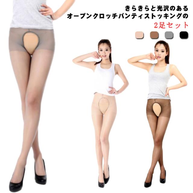2足セット 光沢 オープンクロッチ オールスルー 穴あき ストッキング クロッチオープンストッキング セクシー ブラック グレート 肌色 コーヒー