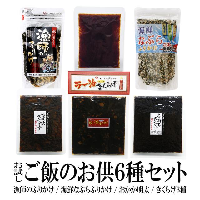お試しご飯のお供6種セット つぼ漬け 子持ち ラー油 おかか明太 なぶらふりかけ 漁師ふりかけ 送料無料 きくらげ 海鮮 なぶら 美味しい ふりかけ ご飯のお供 たっぷり使えるえび わかめ しらす 大容量 お試し 子供 お子様 お弁当 おにぎり