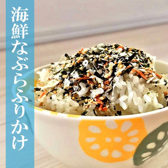 ふりかけの素(いりごま、食塩、かたくち鰯粉末、焼のり、ぶどう糖、鰹節粉末、砂糖、でん粉、その他)(国内製造)、わかめ加工品(わかめ、砂糖)、いりごま、ポテトフレーク、ツノナシオキアミ、素干えび、砂糖、食塩、澱粉分解物、香辛料/調味料(アミノ酸等)、甘味料(ステビア)、(一部にえび・小麦・ごま・大豆・さばを含む)