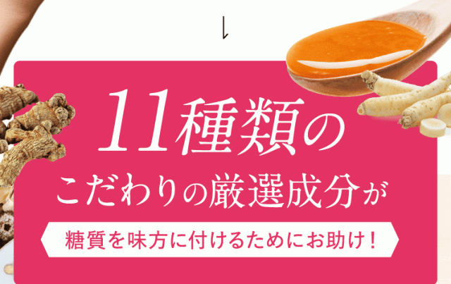 還元麦芽糖(国内製造)、ブドウ種子エキス、難消化性デキストリン(水溶性食物繊維)、乳たんぱく、抹茶、黒ショウガエキス、アマチャヅルエキス、カンカエキス、ジンセンベリーエキス、高麗人参エキス、発酵紅参エキス、はちみつ末/セルロース、ステアリン酸カルシウム、二酸化ケイ素、環状オリゴ糖