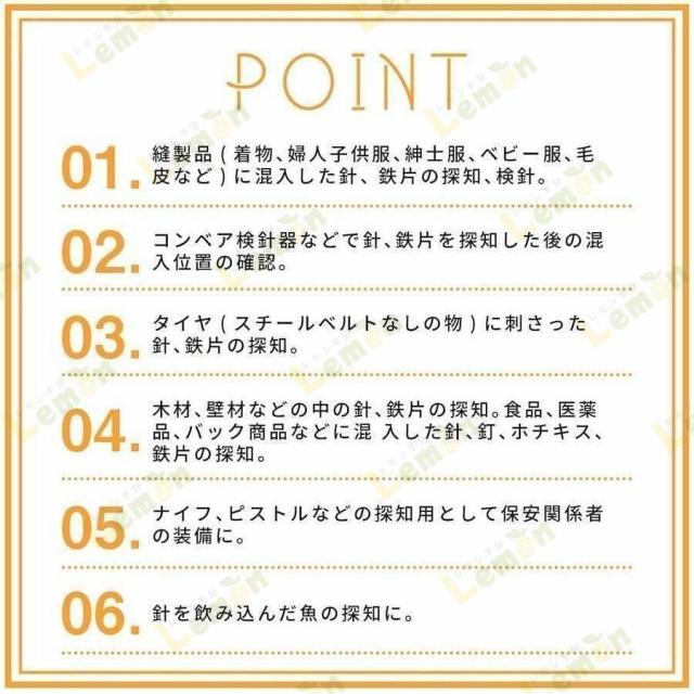 木材、壁材などの中の針、鉄片の探知。食品、医薬品、バック商品などに混入した針、釘、ホチキス、鉄片の探知。