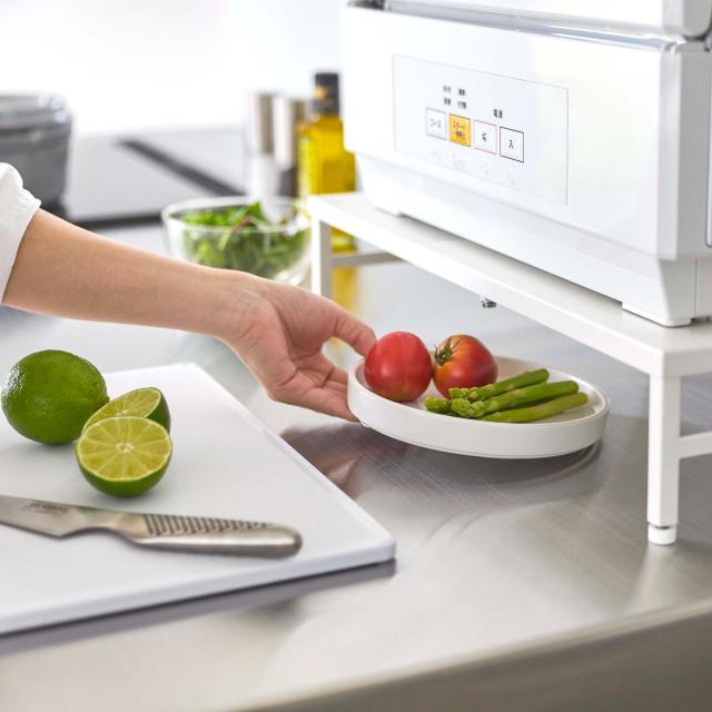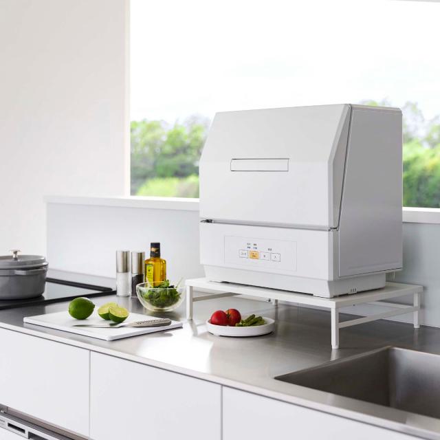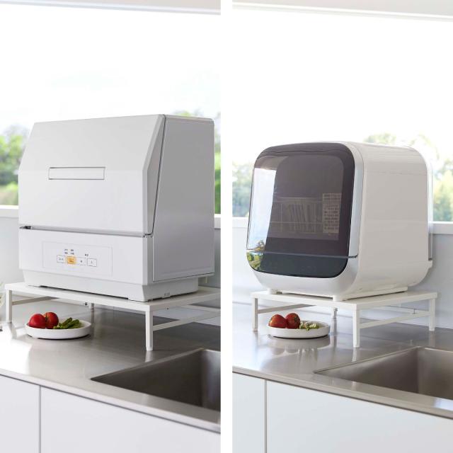 調理台の上に設置しても、天板下を利用して食器やラップなどの小物などをラック下に収納できるので、作業スペースを確保して広々キッチンを使うことができます。小型の食洗機を置く際には、ラックの幅を伸縮させて食洗機の幅に調節することで省スペースに収納することができます。ラックの幅を長めに調節して設置すれば、食洗機置き+ちょっとしたものを置くキッチンラックとしても使用できます。
