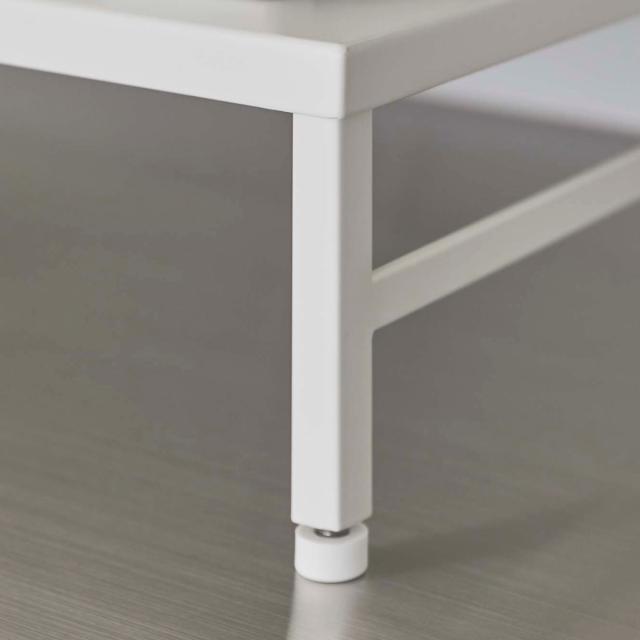 ラックの脚にはアジャスターが付いているので、傾斜や段差がある場所にも対応し、ガタつきを防止できます。アジャスターは高さ1.5cmまで調整可能です。アジャスターの先端はシリコーン製で滑りやすいシンク上でも安心してお使いいただけます。