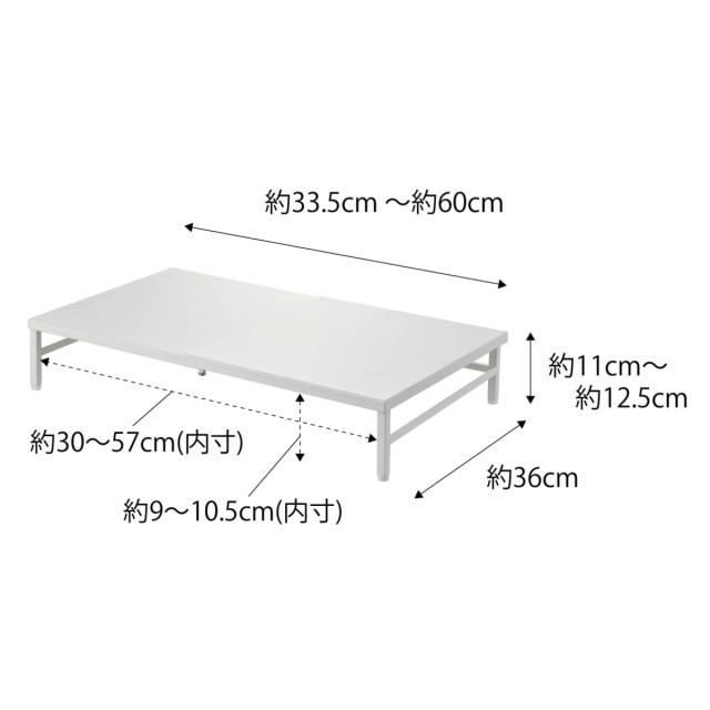 | サイズ | 外寸:約幅33.5〜60×奥行36×高さ11〜12.5(cm) ラック下:約幅30〜57×奥行34×高さ9〜10.5(cm) |