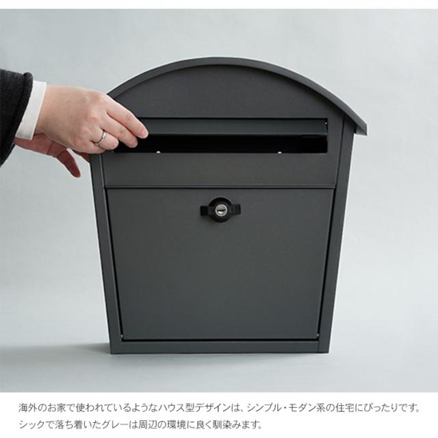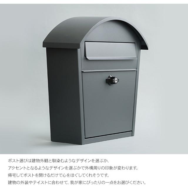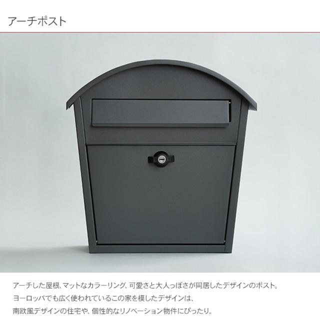 アーチした屋根、マットなカラーリング、可愛さと大人っぽさが同居したデザインのポスト。