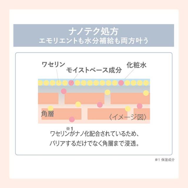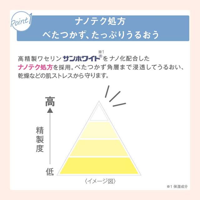 ●高精製ワセリン「サンホワイト※1」をナノ化配合したナノテク処方により、肌表面のバリアとしてうるおいを保つだけでなく、角層まで浸透して水分補給も。