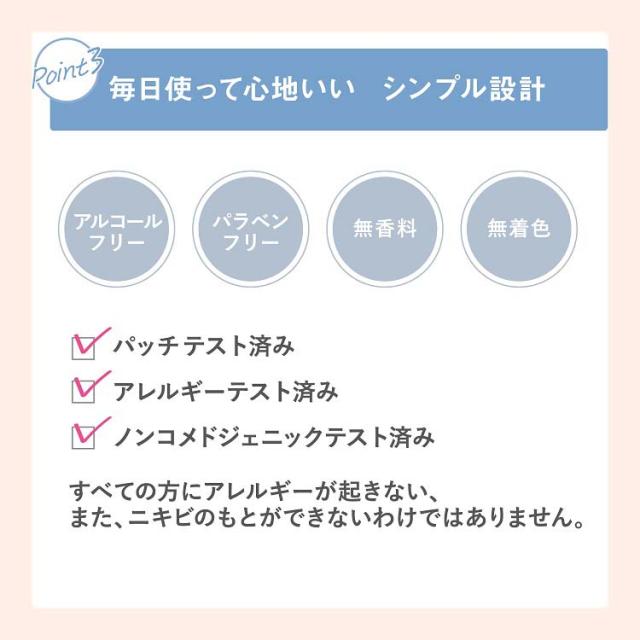 ●パッチテスト済み、アレルギーテスト済み、ノンコメドジェニックテスト済み。(すべての方にアレルギーが起きない、また、ニキビのもとができないわけではありません。)