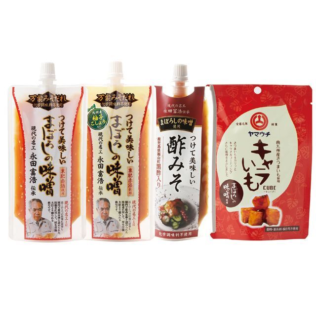 厚生労働大臣より卓越した技術者に贈られる「現代の名工」に認定を受けました、永田富浩の逸品『まぼろしの味噌』で造った、万能みそだれ各種とお芋のお菓子の美味しい4点セット。
