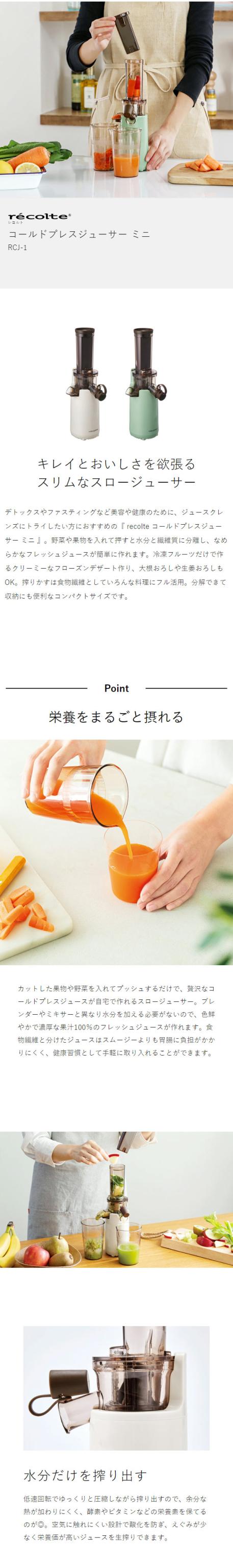 [ recolte コールドプレスジューサー ミニ ]レコルト スロージューサー ミニ ジューサー 小型 低速ジューサー 縦型 コンパクト コールドプレスジュース 手作り フレッシュジュース フルーツ 野菜 フローズン 手作り豆乳 RCJ-1【送料無料】