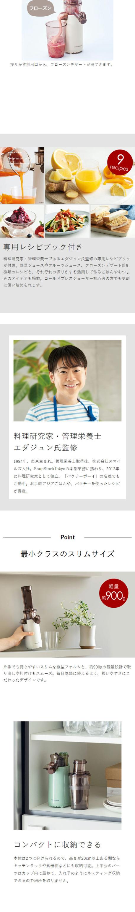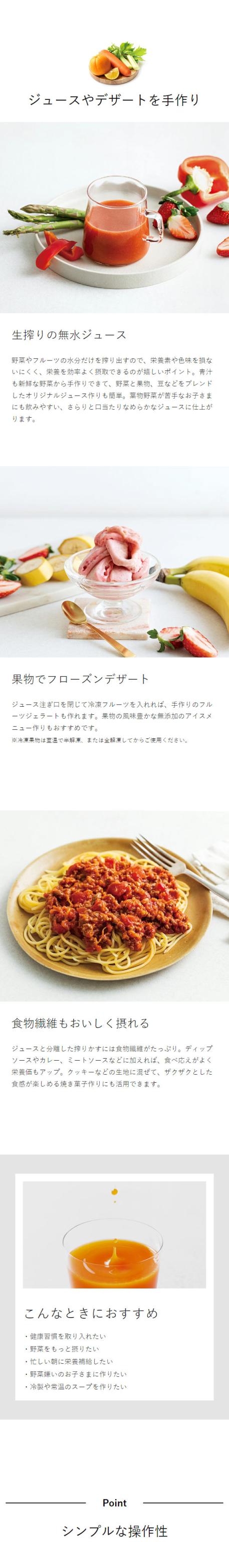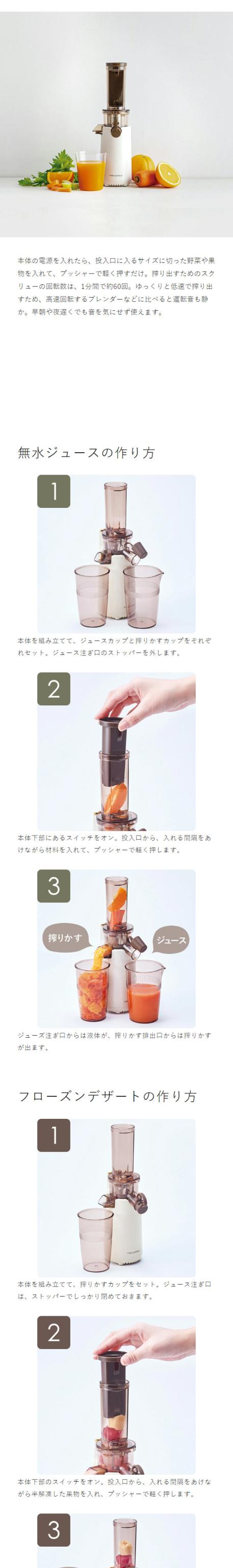 野菜や果物を水分と食物繊維に分離して、濃厚なコールドプレスジュースが作れるスロージューサー。冷凍フルーツを使ったフローズンデザートや豆乳作りもOK。スリムな縦型タイプです。