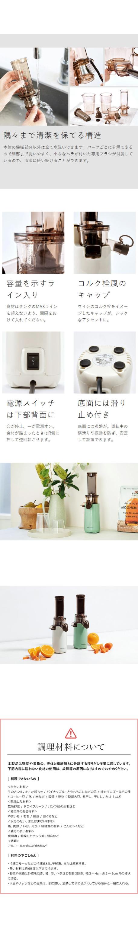 余分な熱や水分を加えず、天然100%の濃厚なフレッシュジュースを搾り出す『 recolte コールドプレスジューサー ミニ 』。カットしたフルーツや野菜を差し込むと、水分と食物繊維に分離。苦手な野菜でも簡単に、なめらかな美味しいジュースに仕上がります。冷凍フルーツを使ったジェラート風のフローズンデザートや、豆乳作りもOK。搾りかすなどの繊維質も、料理に余さず活用できます。コンパクトサイズだから少量の大根おろしや生姜おろしもおまかせです。