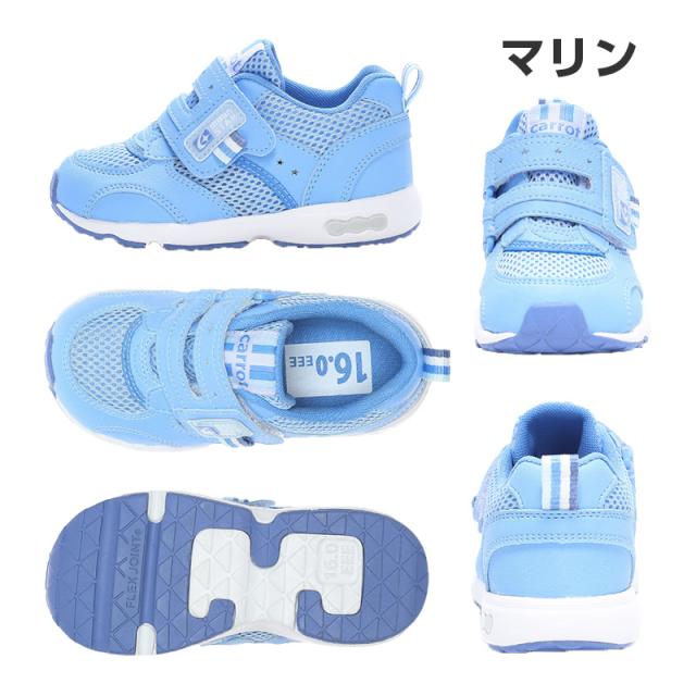 【商品特徴】 「ムーンスター キャロット」の急速乾燥性に優れた幅広「3E」シューズです。水が浸み込みにくく乾きやすい素材を使用しているので、汚れても気軽に洗えて清潔です。アッパーはメッシュと合成皮革のコンビで柔らかく、履き口が大きく開くので脱ぎ履きしやすい作りになっています。子どもの足の成長をサポートする「4つの機能」に加え、「速乾性」を備えた機能商品です。重さは16.0cmで片足約115gです。【ワイド設計】幅広の方に対応した商品です。【つま先ゆったり】つま先にゆとりを持たせた形状で、足の指を圧迫せずにのびのび動かせます。【カウンターボックス】子どもの柔らかくゆがみやすい足を箱型構造でしっかり支えます。【フレックスジョイント】足の曲がりと同じ位置で靴が曲がる設計で、足に余計な負担をかけません。【Ag+抗菌防臭】銀イオンの抗菌作用でにおいのもととなる菌の増殖を抑制し、防臭効果を発揮します。 【洗えるインソール】足裏になじみ、取り出して洗濯ができるので靴内を清潔に保てる中敷きです。【急速乾燥】従来品の約2倍の速さで乾きます(当社品比較)。