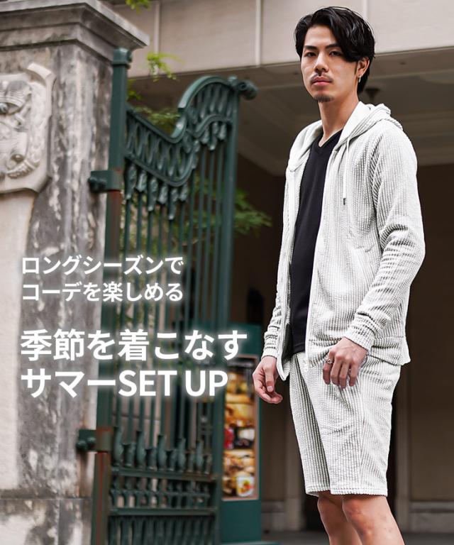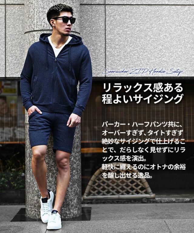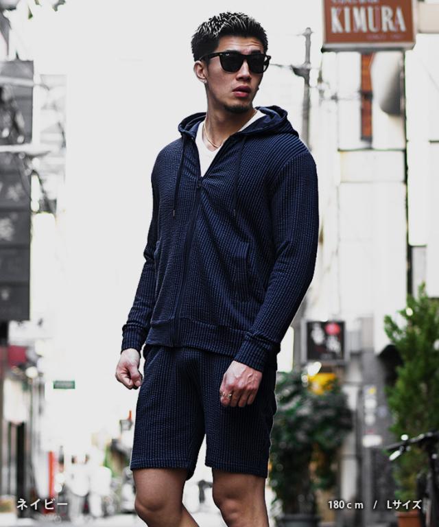 清涼感溢れるオトナの装い『シアサッカーパーカーセットアップ』【シアサッカーパーカーセットアップ】■Design/デザインシアサッカー素材で軽快に纏うZIPパーカーとハーフパンツのセットアップ。生地に凹凸をもたせたシアサッカー素材で清涼感を演出し、伸縮素材も配合することで肌なじみが良く、身体のラインに添った美シルエットに。リラックス感のある佇まいがオトナの余裕を醸し出す。オトナリゾート気分を楽しめるセットアップで有意義な日々を。■Material/素材感綿とポリエステルを使用し、柔らかく軽やかな着用感が特徴。シアサッカー素材のため肌にへばりつかず、汗ばむ時期も爽やかに着こなせるのが嬉しいポイント。