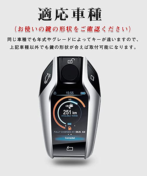 適応車種:BMW 5 シリーズ (G30/G31)(2018年〜), BMW 6シリーズ (G32)(2017年10月23日〜), BMW 7 シリーズ (G11/G12)(2016年〜), BMW X3 (G01)(2018年〜), BMW X5 (G05)(2019年2月27日〜), BMW X7 (G07)(2019年6月〜), BMW i8 , BMW 8シリーズ クーペ / カブリオレ / グラン クーペ BMW M8 クーペ / カブリオレ のディスプレイキーに適合します。(お使いの鍵の形状をご確認ください)※上記車種以外でも鍵の形状が合えば取り付け可能になります。購入する前に適合キーモデルの画像と一致しているかどうかをご確認してくださいませ。