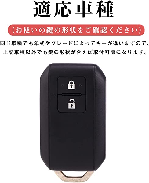 適応車種:新型ソリオ SOLIO / ソリオ バンディット BANDIT SOLIO(2020年11月□)・新型スペーシア ・新型スペーシアカスタム・フレアワゴン FLAIR WAGON (2018年2月□)・新型 スイフト ・ 新型 ワゴンR MH35S / MH55S ・ 新型 ワゴンRスティングレー MH35S / MH55S ・ クロスビー(XBEE)MN71S・ 新型 ジムニー JB64W ・ 新型 ジムニーシエラ JB74W ; 新型 スイフト XG,RS, SPORTS ; 新型ハスラー;新型ソリオ(MA27S); スベーシア; 新型ワゴンRMH95S ; 新型スイフトRS ハイブリッド;新型スイフト ハイブリット車は など。同車種でも年式によりスマートキーの形状が異なる場合がございます。(お使いの鍵の形状をご確認ください)※上記車種以外でも鍵の形状が合えば取り付け可能になります。購入する前に適合キーモデルの画像と一致しているかどうかをご確認してくださいませ。