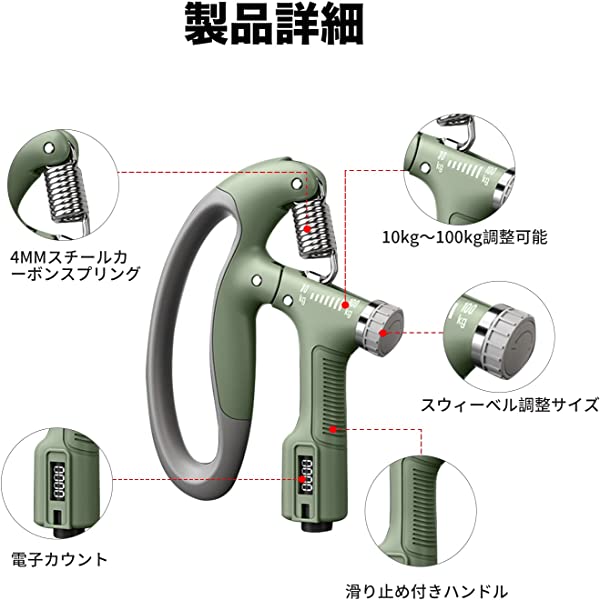 【負荷の強さが調整でき】ハンドルは、力に応じて10kg〜100kgの荷重に調整できます。負荷の強さを調整するためのステンレス製スプリングが付属しています。右に回すと握力が上がり、左に回すと握力が下がります。強さはお好みで調節してください。