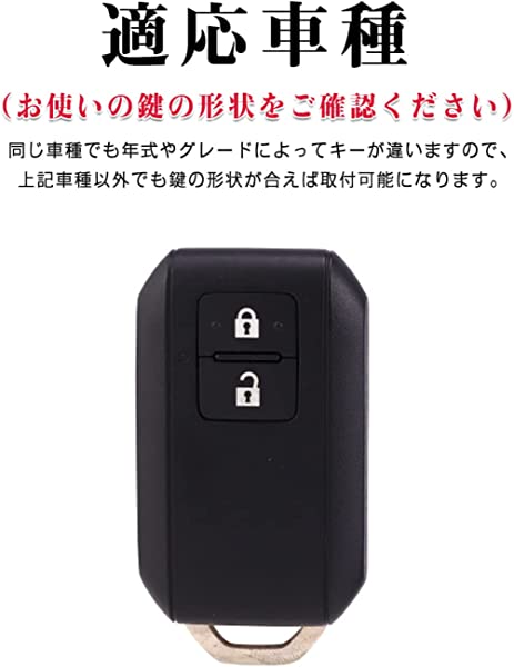 適応車種:新型ソリオ SOLIO / ソリオ バンディット BANDIT SOLIO(2020年11月)・新型スペーシア ・新型スペーシアカスタム・フレアワゴン FLAIR WAGON (2018年2月)・新型 スイフト ・ 新型 ワゴンR MH35S / MH55S ・ 新型 ワゴンRスティングレー MH35S / MH55S ・ クロスビー(XBEE)MN71S・ 新型 ジムニー JB64W ・ 新型 ジムニーシエラ JB74W ; 新型 スイフト XG,RS, SPORTS ; 新型ハスラー;新型ソリオ(MA27S); スベーシア; 新型ワゴンRMH95S ; 新型スイフトRS ハイブリッド;新型スイフト ハイブリット車は など。同車種でも年式によりスマートキーの形状が異なる場合がございます。(お使いの鍵の形状をご確認ください)※上記車種以外でも鍵の形状が合えば取り付け可能になります。購入する前に適合キーモデルの画像と一致しているかどうかをご確認してくださいませ。