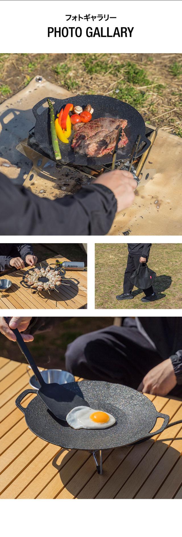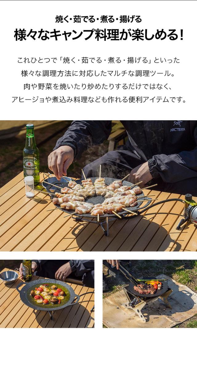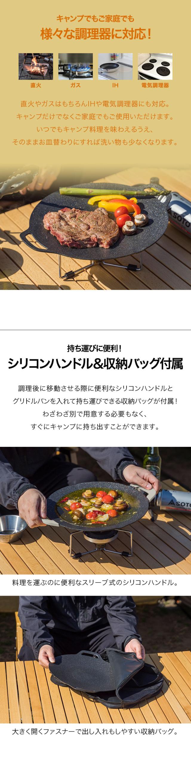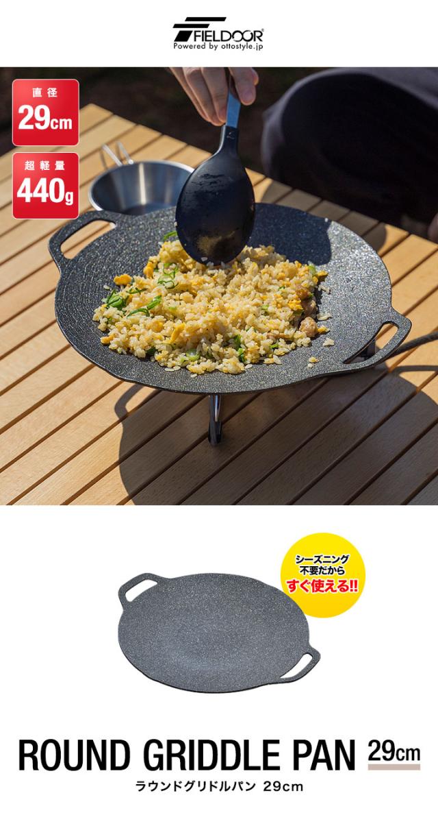 FIELDOOR ラウンドグリドルパン Sサイズ 丸型 29cm×34.5cm 直火/ガス/IH対応 軽量アルミ合金 グリルパン マルチグリドルパン グリルプレート フライパン アウトドア キャンプ キャンプ飯 シリコンハンドル・バッグ付き 1年保証 送料無料