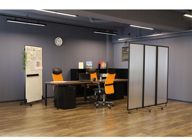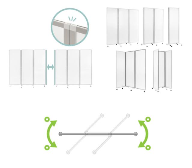 360°回転可能で容易にレイアウト変更可能や折りたたみができる3連パーテーション。