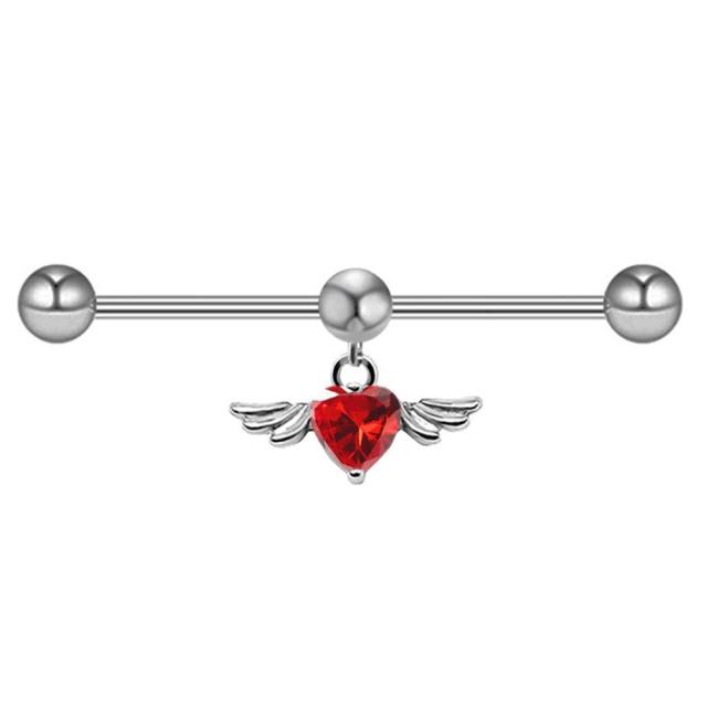 長いインダストリアル用の16ゲージのストレートバーベルに赤色レッドのハートのキュービックジルコニアに翼をデザインしたチャームが揺れるボディピアス。