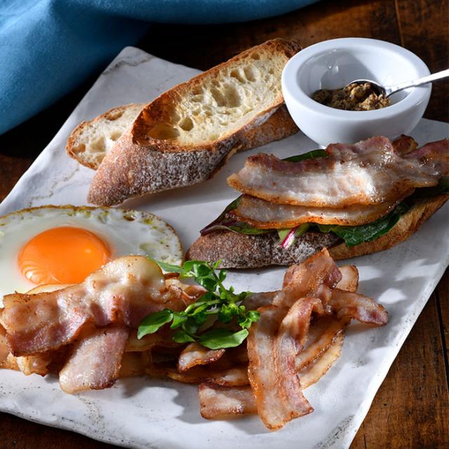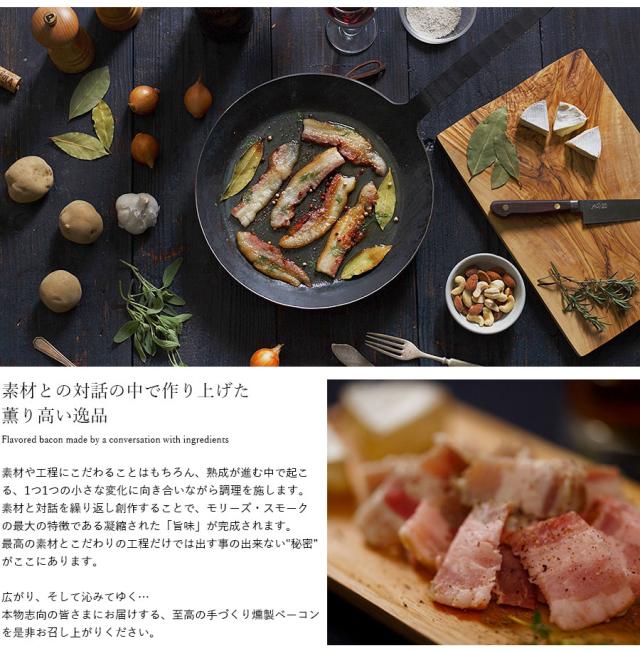 北海道産ラベンダーポークとフランス・ブルターニュ産豚を、それぞれ氷温熟成。桜チップ&ミズナラ木炭でじっくり燻し、まろやかな旨みを閉じ込めた。ゲランド塩とハーブを名脇役に、無添加で手作りしたベーコンは、脂の品のよさ、味の奥深さに驚かされるはず。