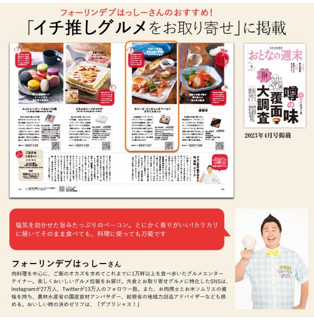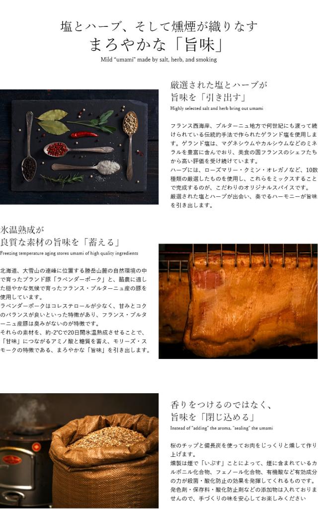 ○原材料名:豚バラ肉(北海道産、フランス産)、塩(フランス産)、てん菜糖(北海道産)、ハーブ