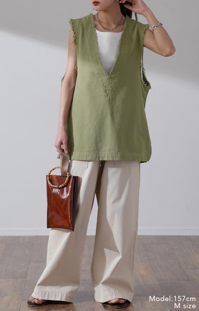 着るだけで旬な印象にしてくれるトレンドライクな深Vネックベストです。