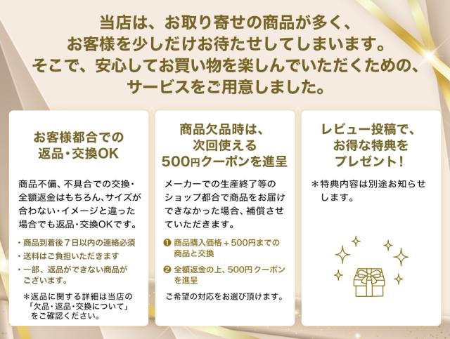 ・対象商品が欠品になり、入荷予定が未定となってしまった場合、商品をお届けすることができず、ご注文をキャンセルさせていただく場合もあります。その際、代金は速やかに全額ご返金させて頂きます。