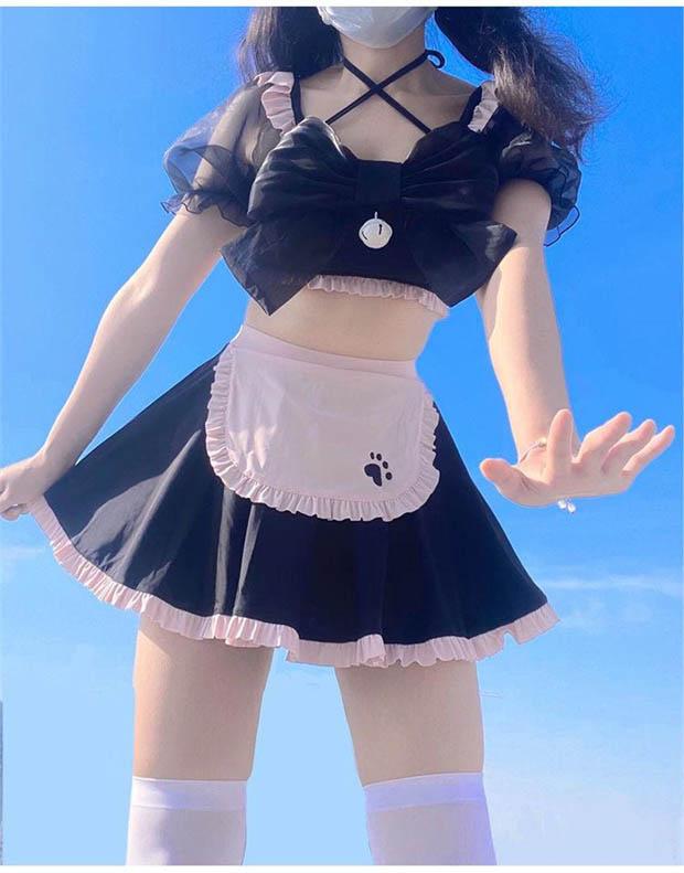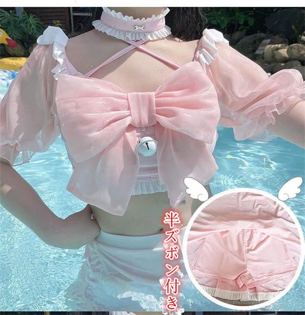 【レビュー投稿で+5%還元】水着 レディース ロリータ風 メイド水着 リボン かわいい フリル オフショルダー リボン 水着 肩出し 着痩せ 撮影 温泉 プール ビーチ ホワイトXS S M L 2L df582c0c0m5