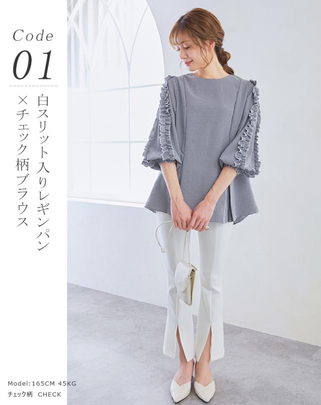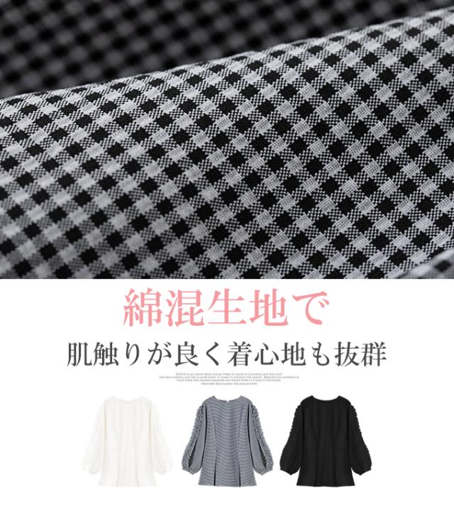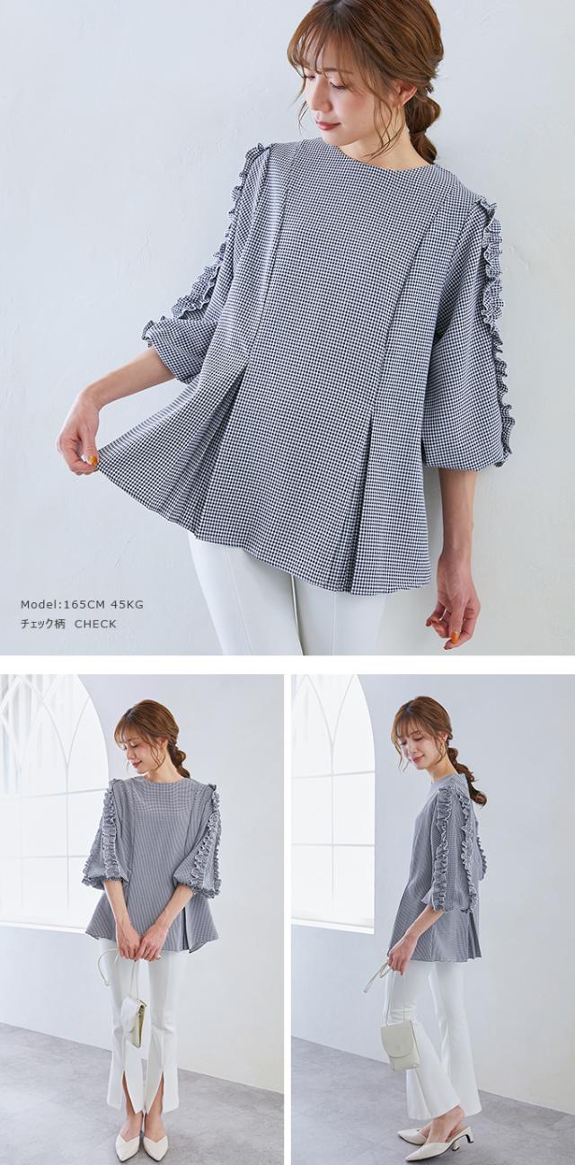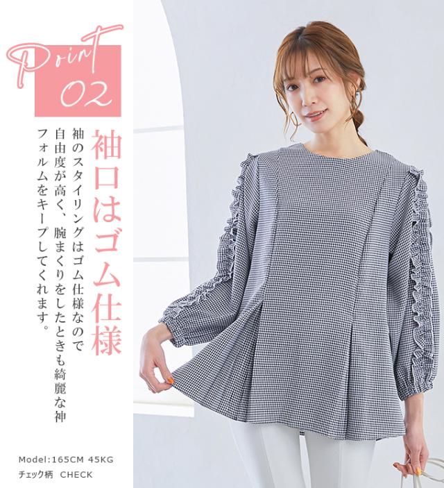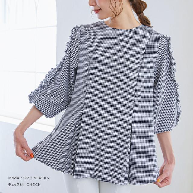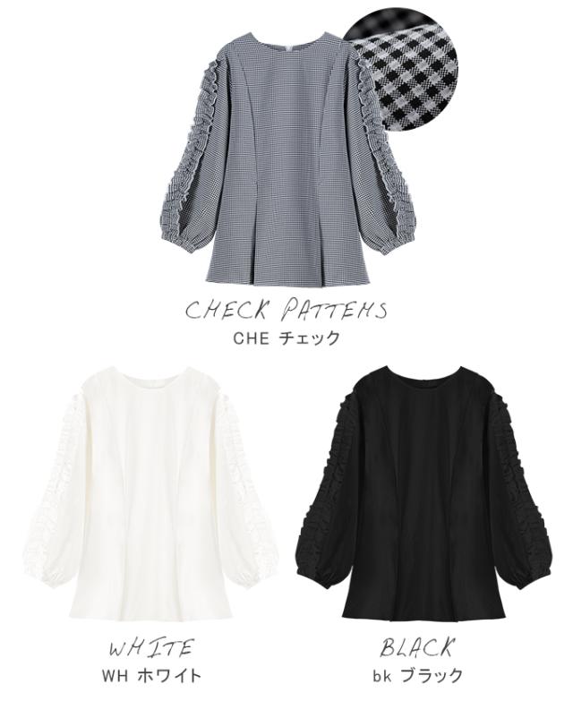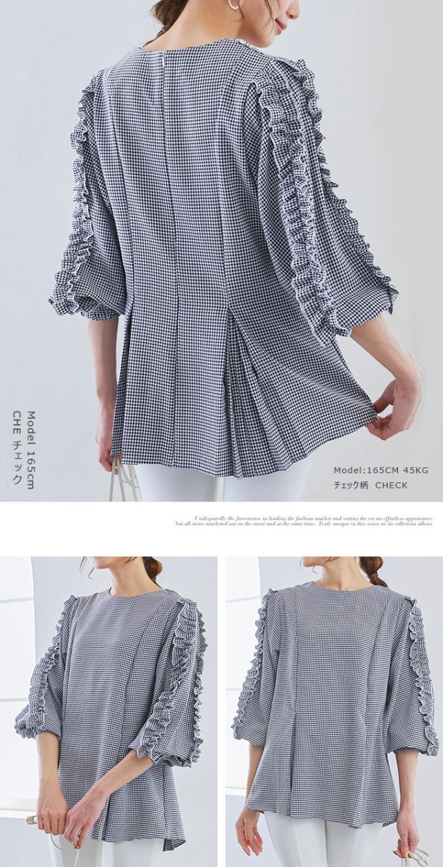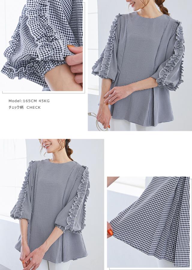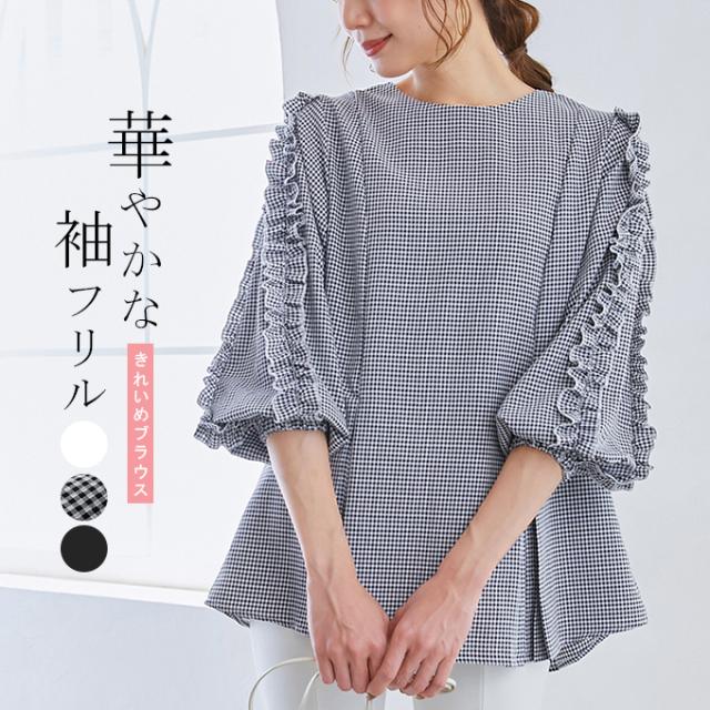フリルブラウス ボリューム袖 シャツ ブラウス きれいめ お洒落 体型カバー フリル 無地 ギンガムチェック トップス ダブルフリルブラウス ランタン袖