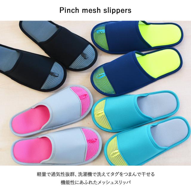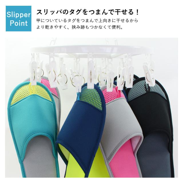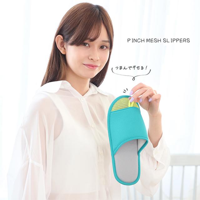 甲のタグをつまんで干せる便利なメッシュスリッパ。