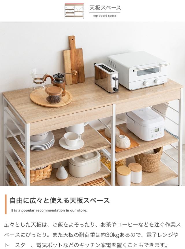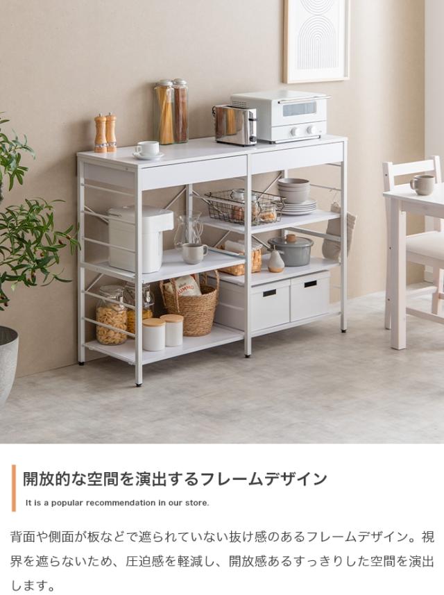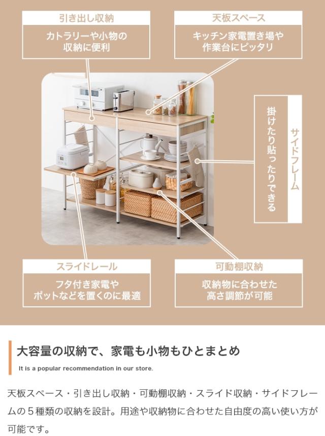 | 説明 | たっぷり大容量収納を叶える『Cammy(キャミー)』のレンジラック。 幅120cmと豊富な収納力を備えており、キッチンに不可欠な家電や雑貨・食器等をまとめて1台に収納していただけます。また、シンプルなフレームデザインは視界を遮らず、圧迫感を与えないため、お部屋をすっきり見せたい方にもおすすめです。 |