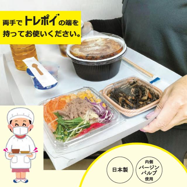 ■病院や介護施設、学校やホテルなど、食事の配膳が必要な場所で便利に使える紙製トレーです。