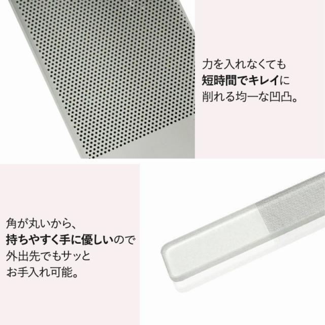 | 商品の説明 | 爪の磨きたい表面や、長さを変えたい箇所にガラス面を当ててゆっくり丁寧にこするだけ。 特殊加工で表面にはキメの細やかな突起状がついているため、 短時間でキレイに削れます◎ オイルやマニキュアを塗らなくても、変化が楽しめます◎ ガラス製なので、錆びることなく水洗い可能。 使った後に面倒な手間をかけることなく繰り返し使えてとっても経済的。 「仕事や学校でネイルができない」 「もっとネイルを長持ちさせたい」 そんなときにも大活躍なのがガラス製爪磨きなんです。 力を入れなくても短時間でキレイに削れる均一な凹凸。 角が丸いから、持ちやすく手に優しいので外出先でもサッとお手入れ可能。 持ち運び便利な、専用ケース付なのでコスメポーチに入れても化粧品を傷つけません。 耐久性があるのでながくお使いいただけます◎ ネイルポリッシュ ネイルケア 爪やすり 巻き爪 お手入れ ジェルネイル オフ 艶爪 プチギフト プレゼント ピカピカ ツルツル |