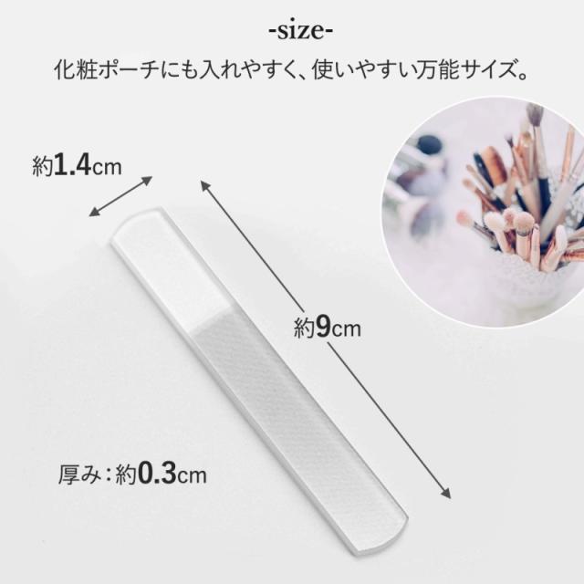 | 主な仕様 | 【サイズ】 約1.4cm×約9cm 厚み:約0.3cm 【素材】 ガラス製 【仕様】 ガラス製爪やすり×1個 専用ケース×1個 |