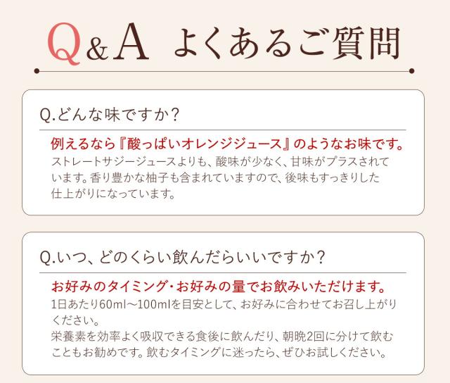 1日60〜100mlを目安に、2〜3倍程度に希釈してお飲みください。※2倍希釈時果汁27.5%(サジー1:ジュースや水など1)