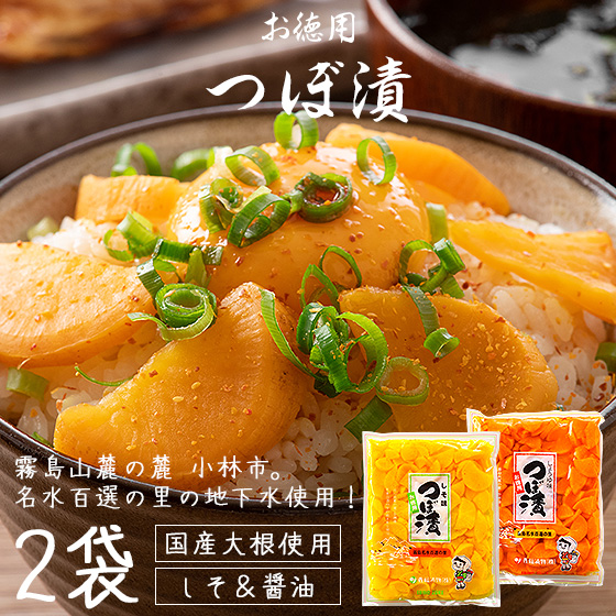 | 宮崎、鹿児島の恵まれた気候と環境から育った大根を、名水百選の里の地下水を使用しこだわりをもって漬け込み熟成させたつぼ漬です。 発酵が生み出す風味の良さが自慢の逸品です。しそ味としょうゆ味の2種類ございますので、お好みでお選びください。 |