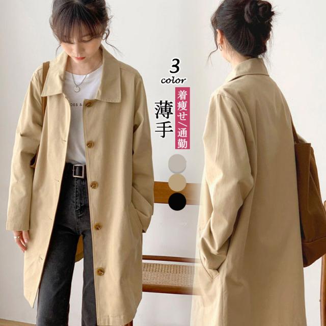 トレンチコート レディース ジャケット スプリングコート 春コート 春服 ロング丈 折襟 無地 カジュアル ゆったり 秋コーデ