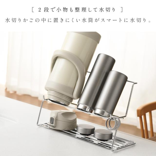 大きいサイズのジャグボトルや冷水筒、スリムなマグボトルなど150ml-2Lまでのボトルをまとめて整理しながら水切りできます。2段式で省スペースなので、キッチンを広く使う事が可能で、上段にはボトル本体を、下段には水筒の蓋や飲み口などをわけて乾かすことが出来ます。